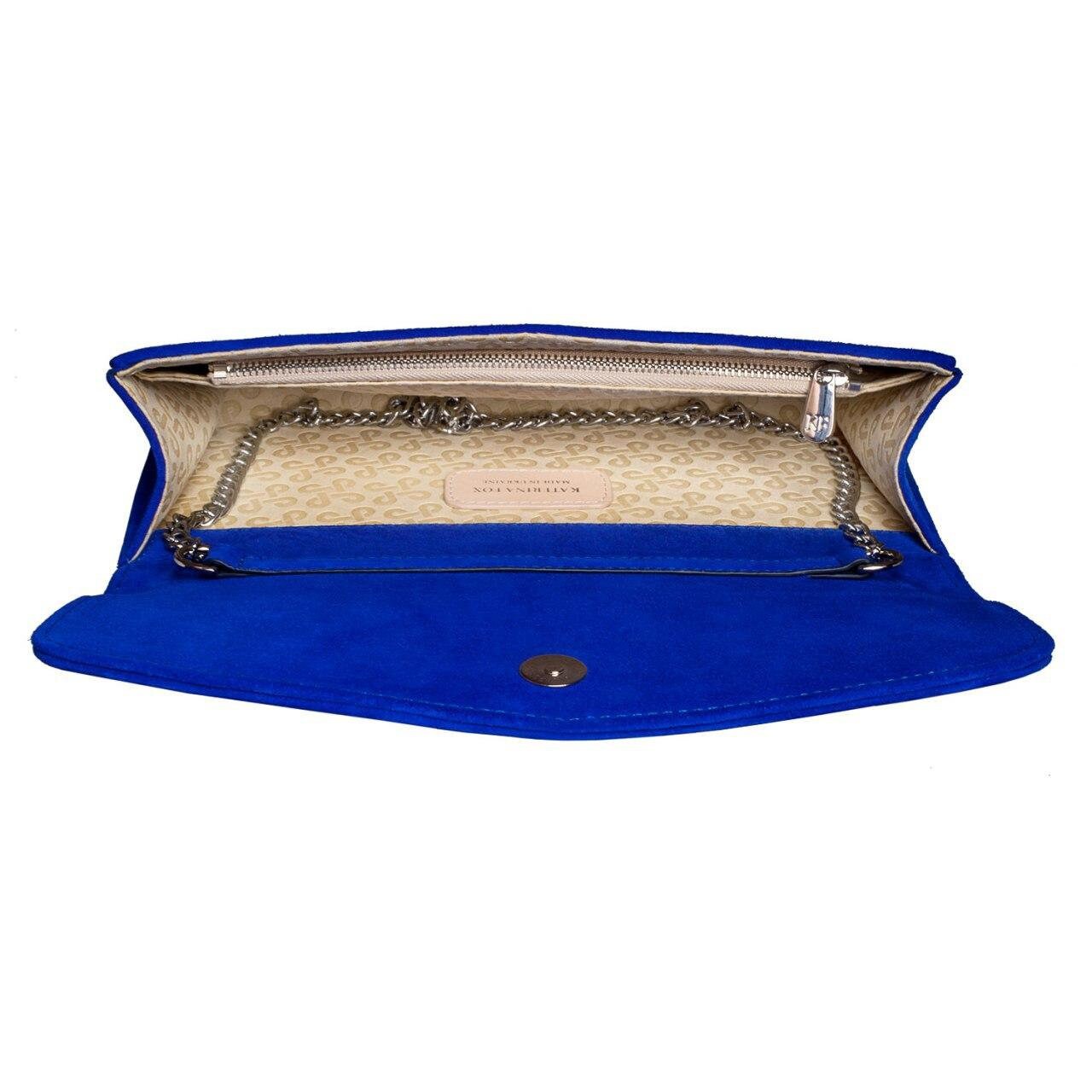 Delivery: In most cases our goods are shipped by FedEx or Ups Express. On rare occasions the goods might be shipped by Ukrposhta. The clients should check in advance an estimate of the amount of customs duty and value added tax. Blue genuine leather suede woman shoulder bag from ukrainian designer Katerina Fox. Stylish bag-clutch rectangular blue with gold chain is perfect for evening dress for any cocktail dress. This bag-the clutch will add Your elegance and luxury. Inside the bag one large compartment, one pocket with zipper that closes with a button magnet.
