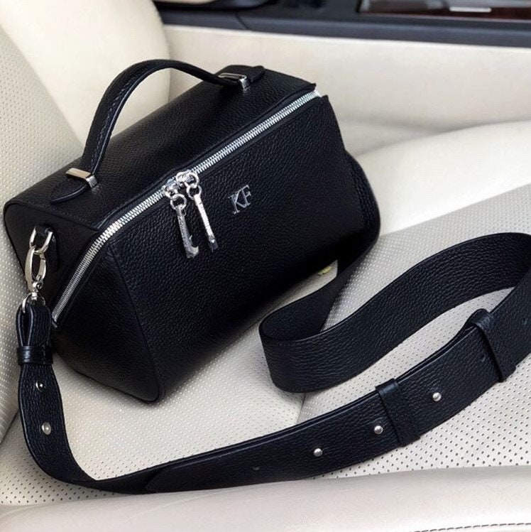 Black genuine leather woman shoulder bag from ukrainian designer Katerina Fox. Fashionable and elegant modern bag KF for bright girls and women. This bag is able to attract attention and highlight your exquisite taste. The internal space of a bag is equipped with one spacious compartment and one zipper pocket. The bag is closed with a zipper. The length of the strap is adjustable. The kit also includes a storage bag.
