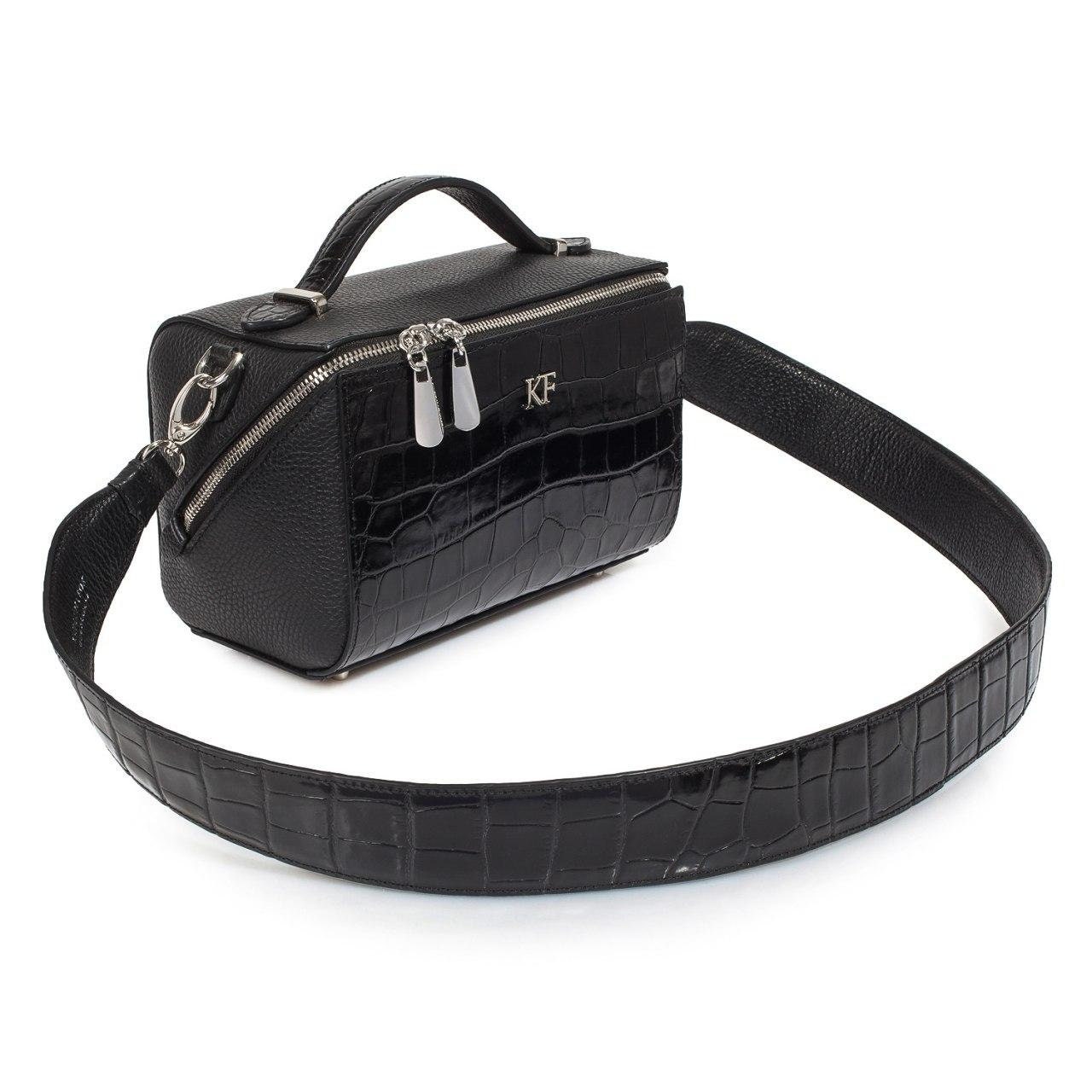 Black genuine leather woman shoulder bag from ukrainian designer Katerina Fox. Fashionable and elegant modern bag KF for bright girls and women. This bag is able to attract attention and highlight your exquisite taste. The internal space of a bag is equipped with one spacious compartment and one zipper pocket. The bag is closed with a zipper. The length of the strap is not adjustable. The kit also includes a storage bag.