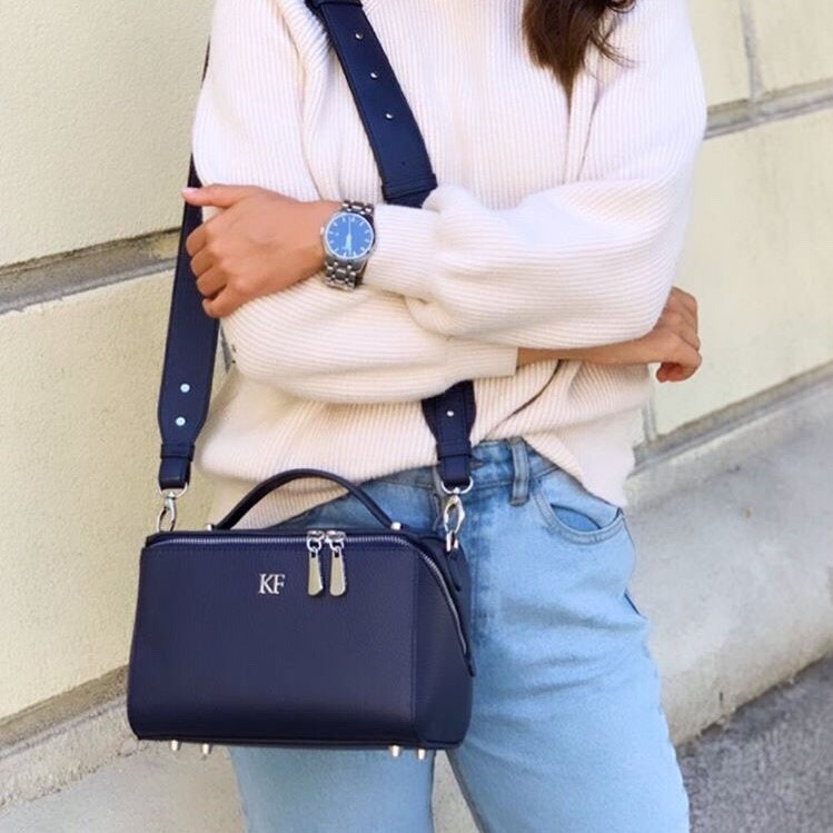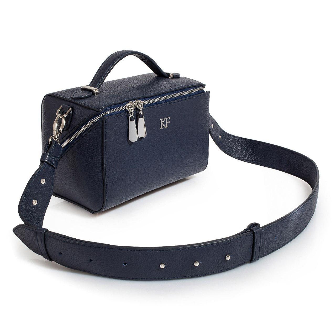 Blue genuine leather woman shoulder bag from ukrainian designer Katerina Fox. Fashionable and elegant modern bag KF for bright girls and women. This bag is able to attract attention and highlight your exquisite taste. The internal space of a bag is equipped with one spacious compartment and one zipper pocket. The bag is closed with a zipper. The length of the strap is adjustable. The kit also includes a storage bag.