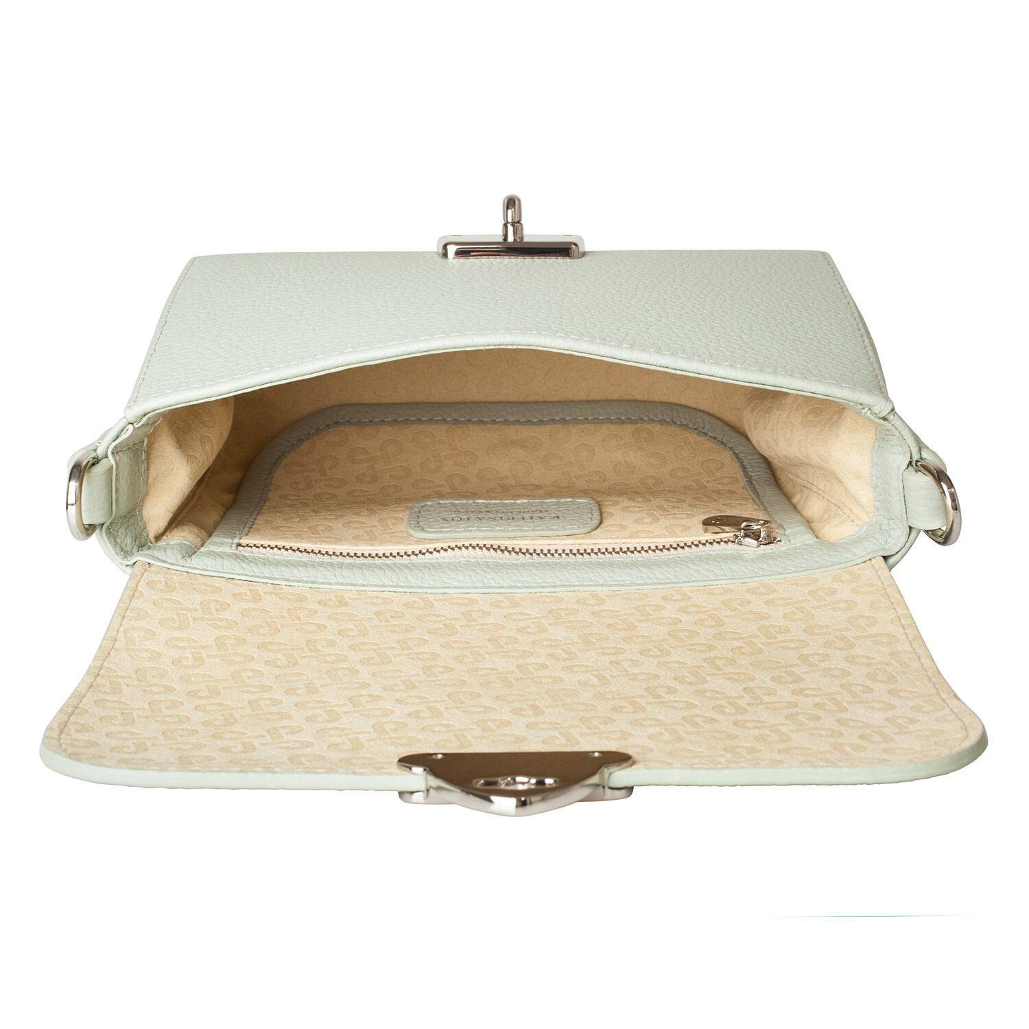 Light Mint genuine leather woman shoulder bag from ukrainian designer Katerina Fox. Fashionable and elegant modern bag KF for bright girls and women. This bag is able to attract attention and highlight your exquisite taste. Inside the bag is one large compartment and a convenient zippered pocket for small items, closes the bag on the clasp. The bag is comfortable to wear on the shoulder or across the shoulder.