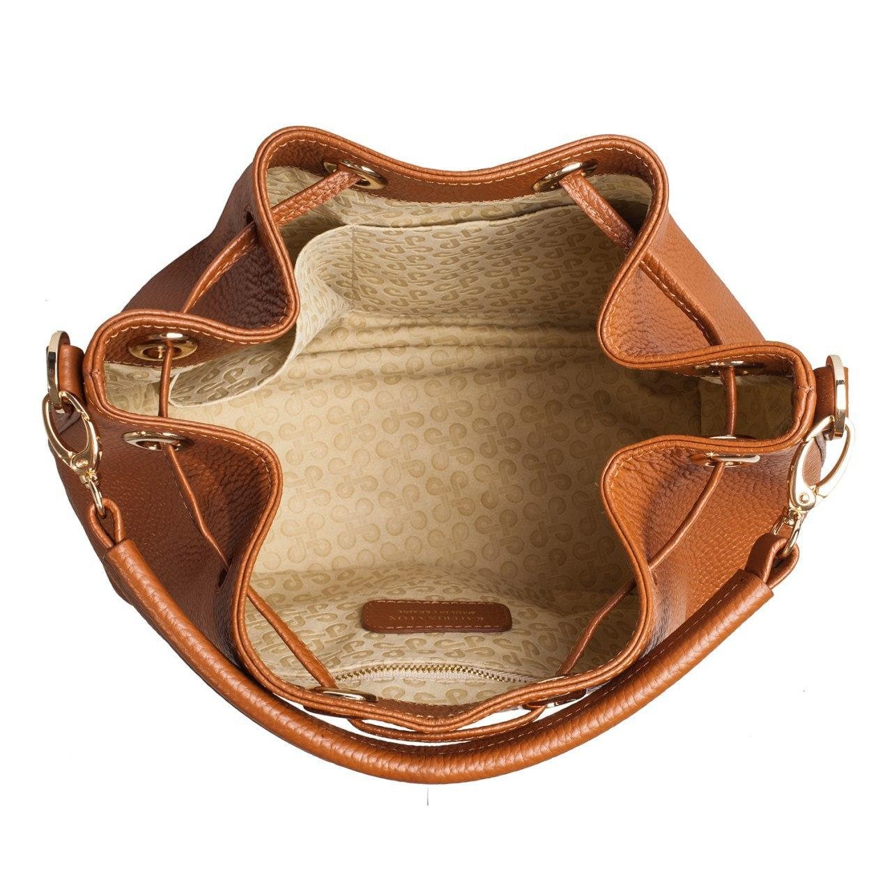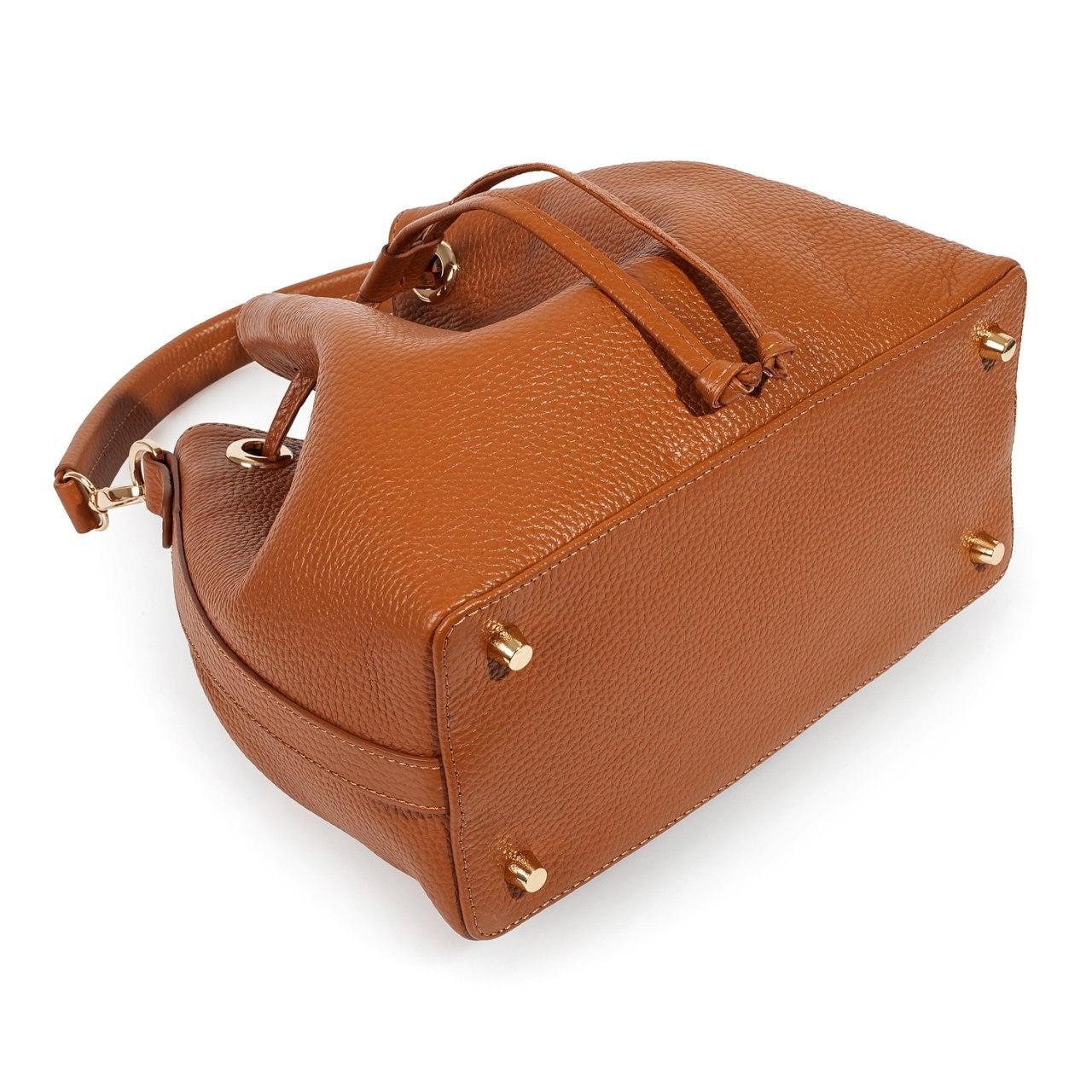 Ginger genuine leather handbag from ukrainian designer Katerina Fox. The advantages of this model is stylish design and excellent leather, from which it is made. All accessories for Katerina Fox bags makes the same factory as for Michael §¬ors, Calvin Klein, DKNY and other famous brands.The internal space of a bag is equipped with one spacious compartment and two patch-pockets and one zipper pocket. The bag is pulled together with a leather lace. The bottom of the bag is protected with metal legs. There is a long handle that allows you to wear the bag on the shoulder. The kit also includes a storage bag.