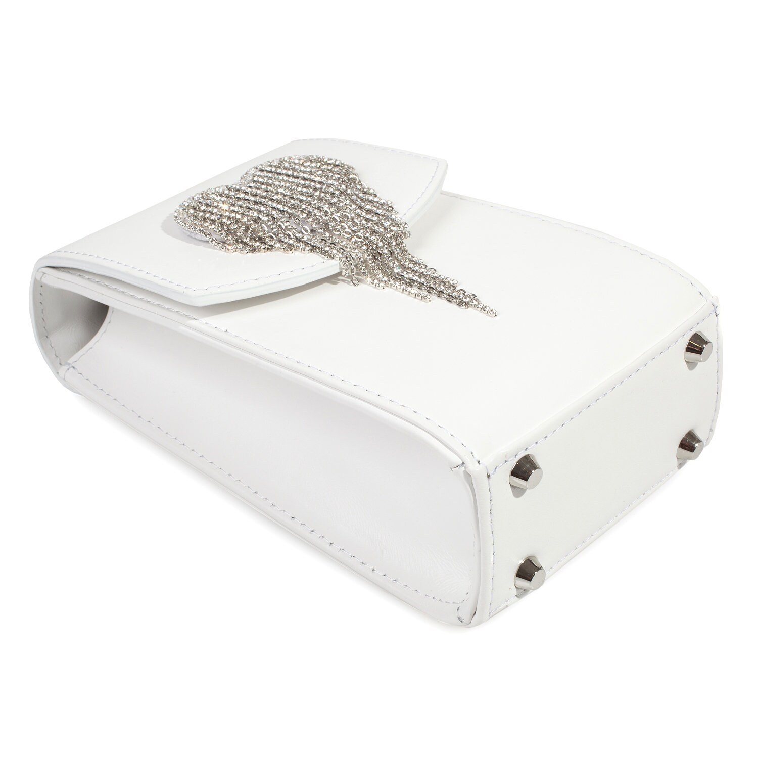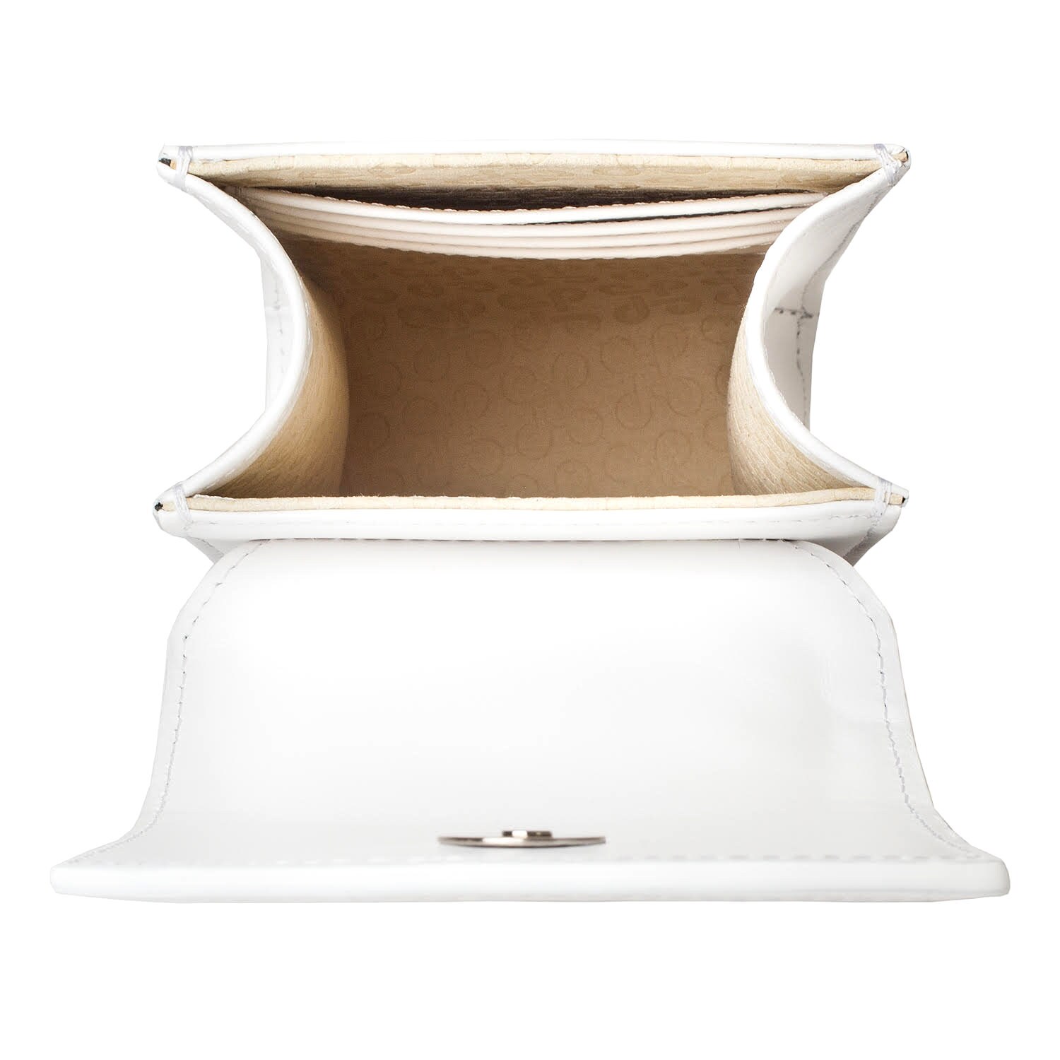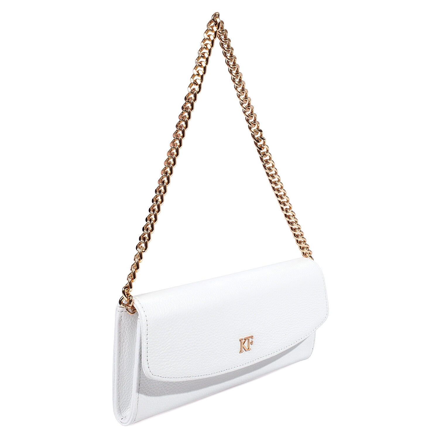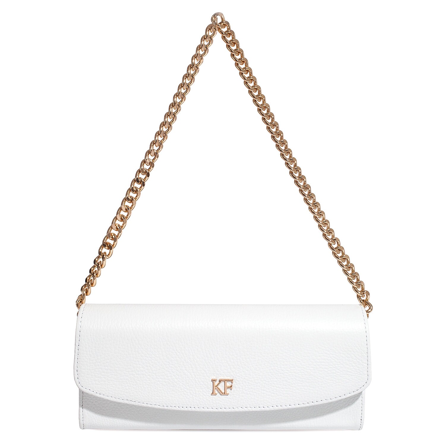 White genuine leather woman crossbody evening bag from Ukrainian designer Katerina Fox. Fashionable and elegant modern bag KF for bright girls and women. This bag is able to attract attention and highlight your exquisite tastes. The internal space of a bag is equipped with one spacious compartment, four patch pockets for cards. The bag is closed on the button-magnet. The kit also includes a storage bag.